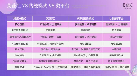 通过对比我们不难发现,传统医美模式如同“重资产开店": 需要你亲自囤货、自行销售,不仅投入门槛高,而且销售过程宛如一个盲盒,市场数据完全不透明。